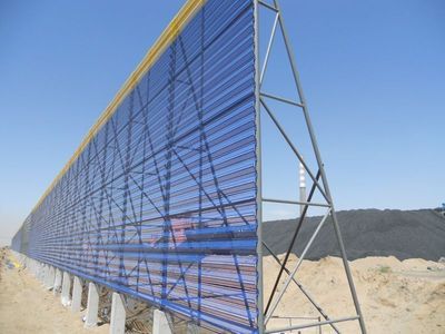 露天存放的各種儲煤場、礦石、石灰堆放等散流物料在遇到三級以上大風(fēng)天氣時經(jīng)常粉塵滿天,給周圍大氣環(huán)境造成嚴(yán)重污染。目前實施的"藍天工程"為集中解決煤堆、灰堆、料堆等堆放散流體物料揚塵污染擾民問題提出了嚴(yán)格的要求。 擋風(fēng)板使用的材質(zhì)根據(jù)使用目的,環(huán)境狀態(tài)不同而不同??刹捎媒饘俨牧?、高密度聚乙烯、EVA樹脂等。我公司推出的擋風(fēng)板采用新型材料一次成型,本材料能最大限度的抵御陽光中的紫外線,抗老化能力強。耐寒-40℃;耐高溫80℃。正常使用壽命大于20年??癸L(fēng)能力設(shè)計在風(fēng)速30m/s,風(fēng)壓750Pa(相當(dāng)于陣風(fēng)12級)。而且在使用過程中基本不用維修,一次投資,長期受益。擋風(fēng)板顏色可根據(jù)用戶的要求或周邊環(huán)境來選定,凡廣告色版上有的顏色,均可采用,顏色一次性加入母料中,加工成型的擋風(fēng)板,色彩均勻,不易褪色。